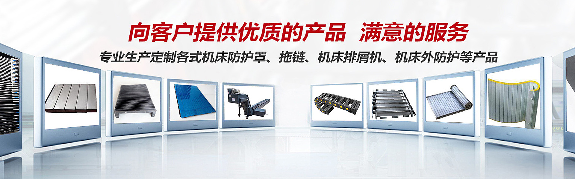 主要產(chǎn)品有:鋼板伸縮式防護罩、新型pvc柔性護罩、風琴式、圓桶式、鎧甲式、卷簾式伸縮護罩、鋁形防護簾、TL橋式鋼鋁拖鏈、橋式全封閉式工程塑料拖 鏈、矩形金屬軟管護套、DGT導管護套、螺旋鋼帶護套、機床導軌刮屑板、T型撞塊槽板、可調(diào)塑料冷卻管、S78系列機床墊鐵等。
